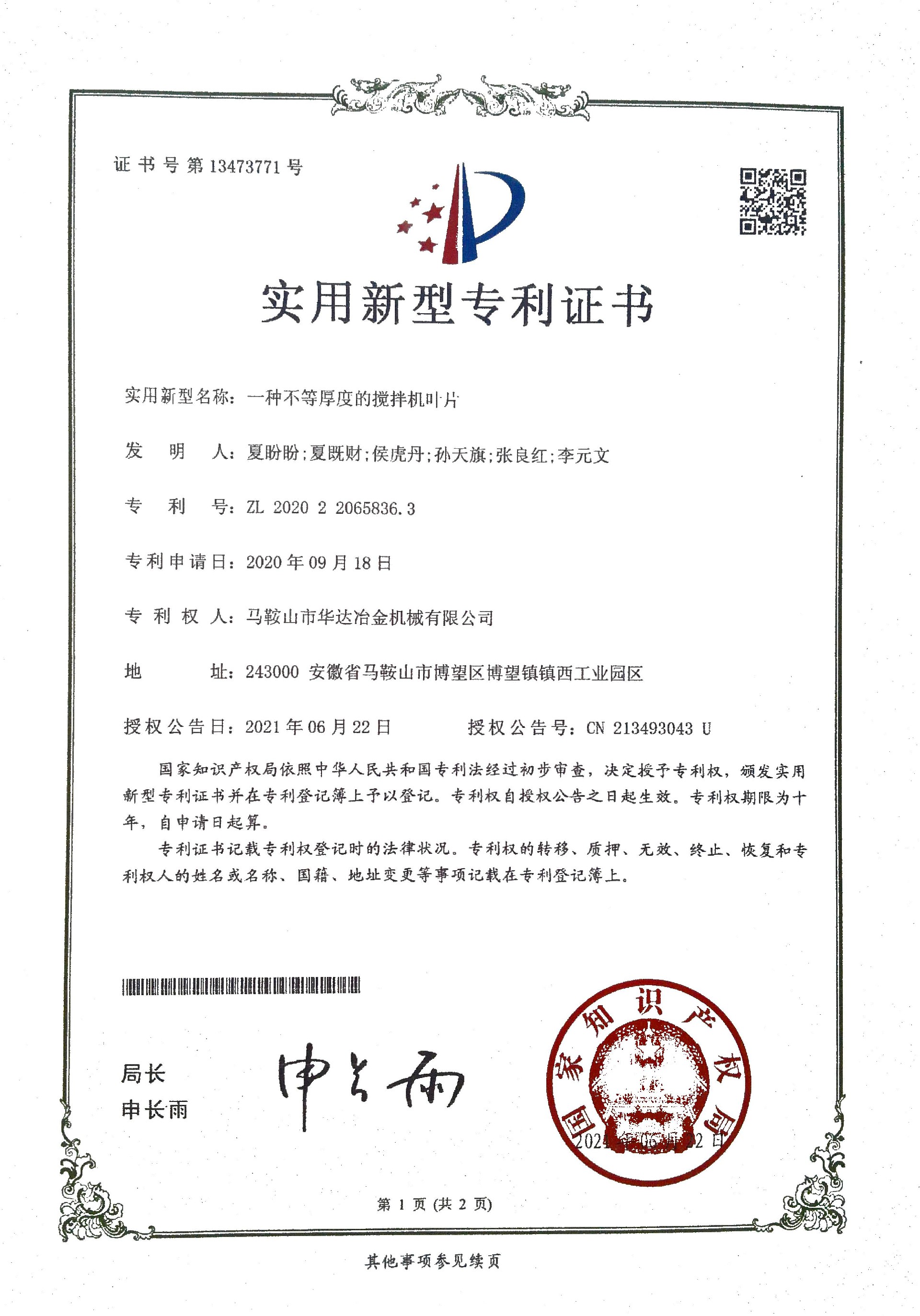 一种立轴行星式混凝土搅拌机铲刀专利证书
