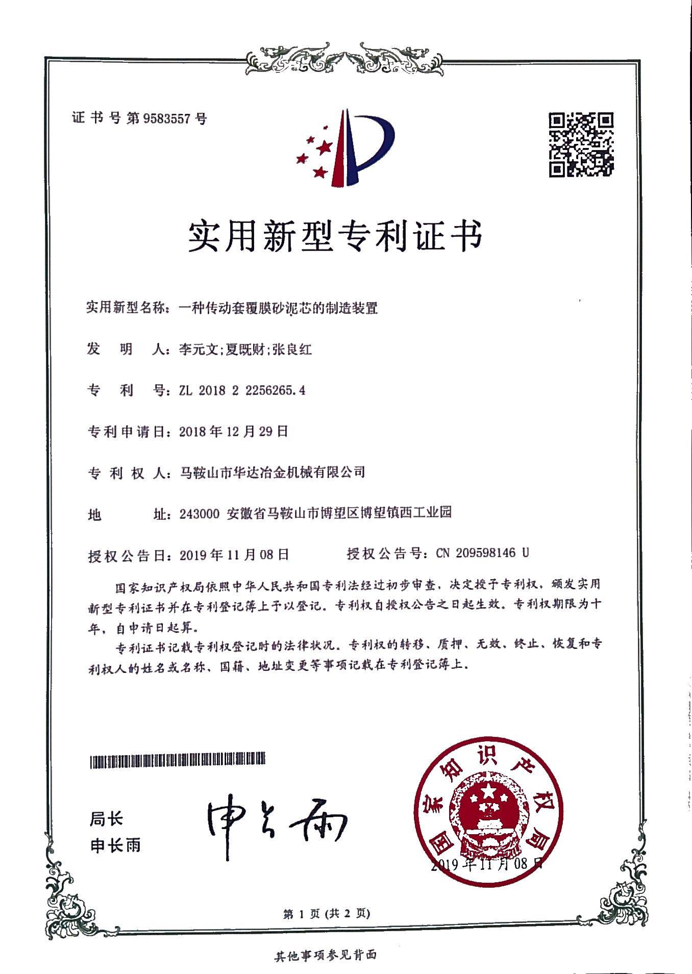 一种传动套覆膜砂泥芯的制造装置专利证书