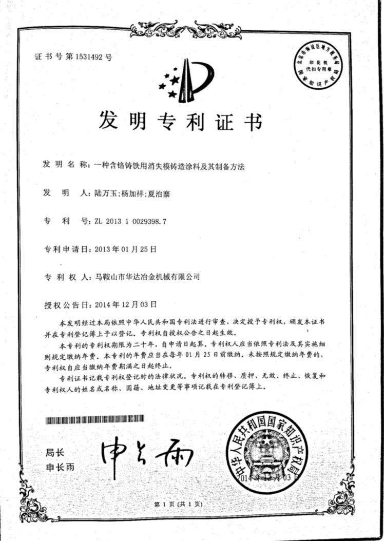 一种含铬铸铁用消失模铸造涂料及其制备方法发明专利证书