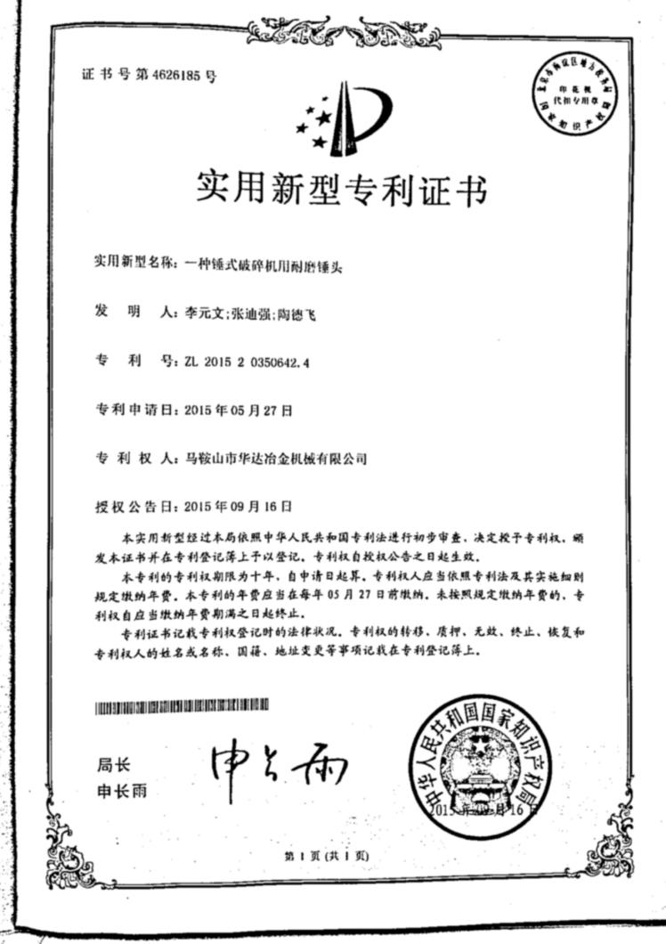 一种锤式破碎机用耐磨锤头实用新型专利证书