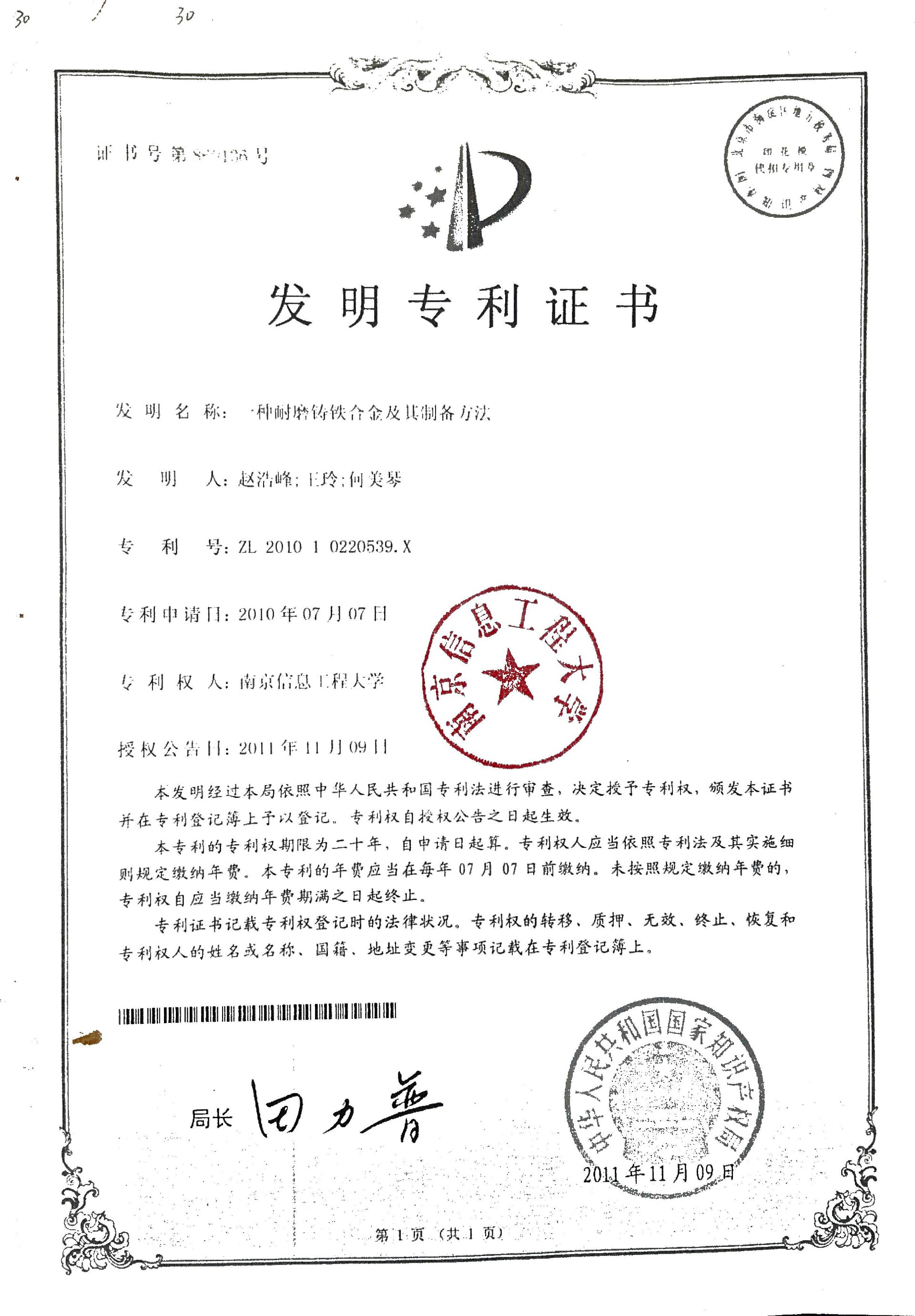 一种耐磨铸铁合金及其制备方法专利证书