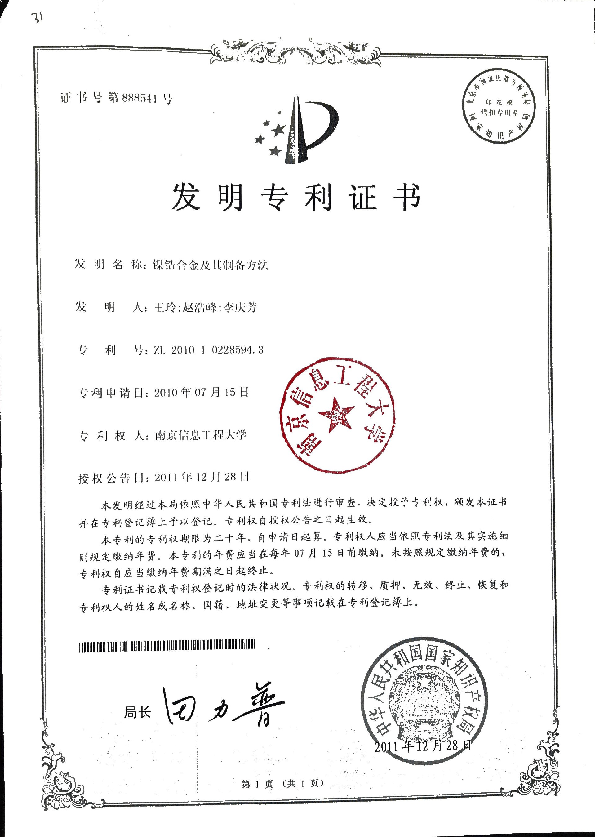 镍锆合金及其制备方法发明专利证书