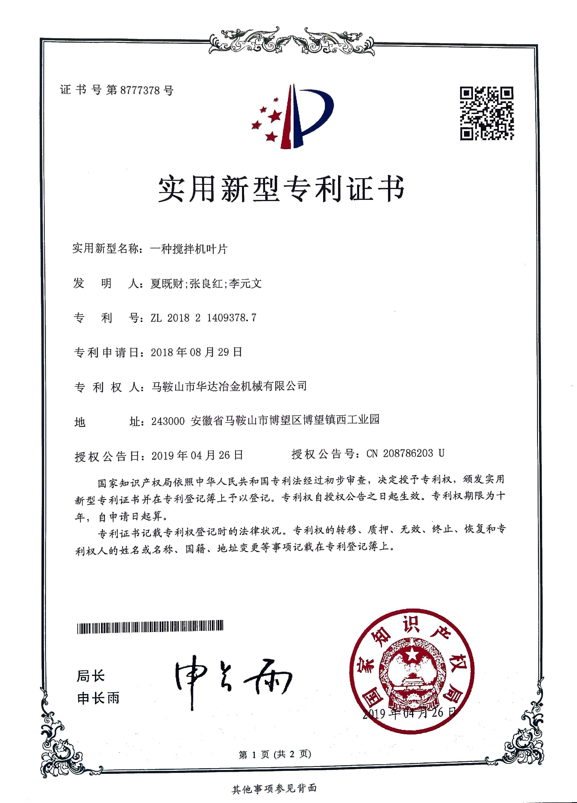 一种搅拌机叶片专利证书
